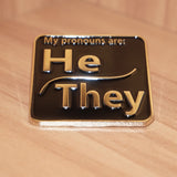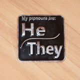 Soft enamel pronoun pin. Black enamel with raised silver lettering.