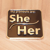 Soft enamel pronoun pin. Black enamel with raised silver lettering.