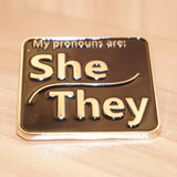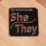 Soft enamel pronoun pin. Black enamel with raised silver lettering.